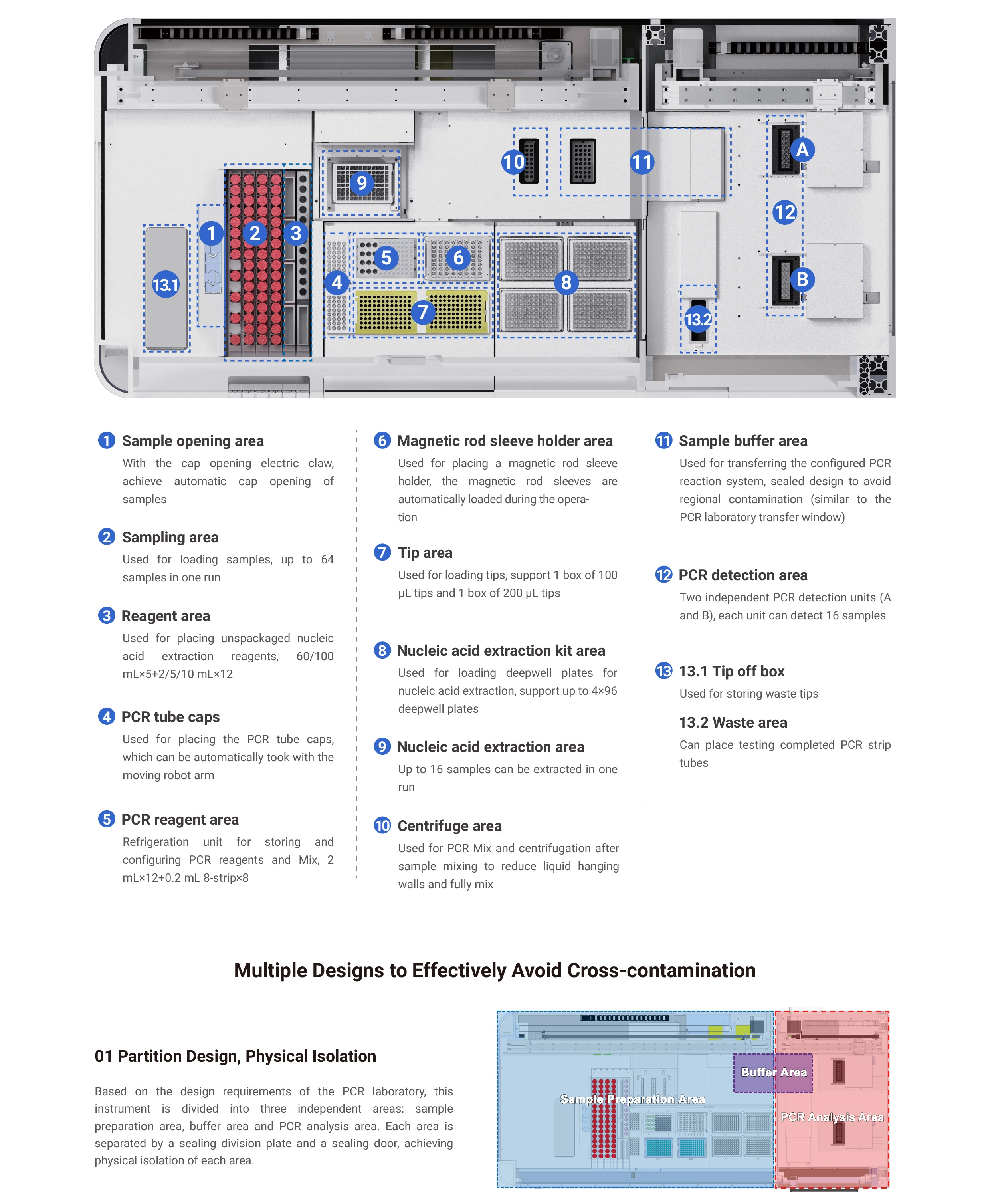 | UV sterilization | One UV sterilization lamp is set in the sample preparation area, buffer area and analysis area respectively, which can be controlled independently |