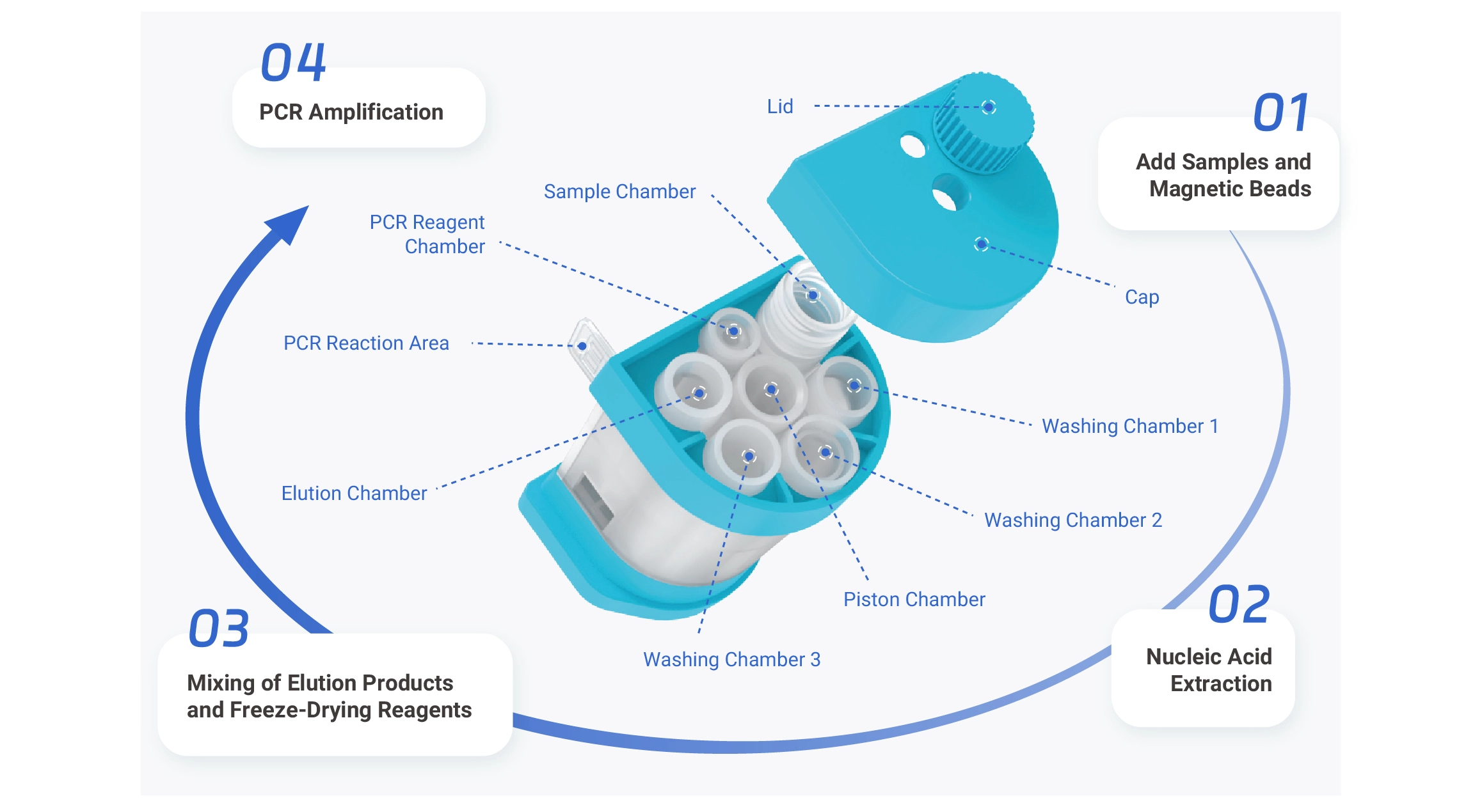 | Consumable well number | 4 reagent chambers, supporting pre-packaged liquid reagents 1 sample chamber with sealing cover 1 detection well, supporting PCR amplification and fluorescence detection |