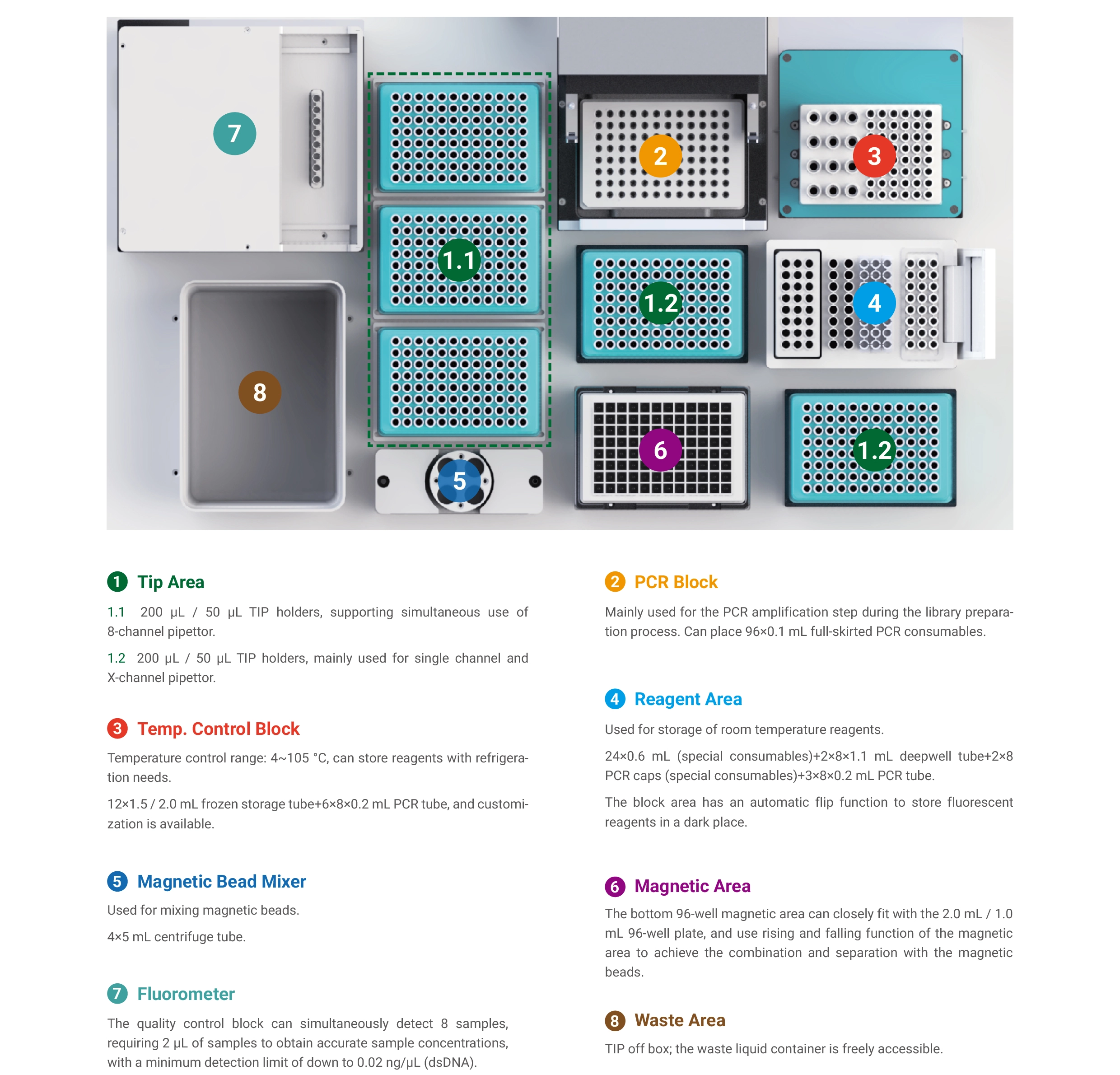 The fluorometer block, independently developed and designed by Allsheng, meets concentration measurement requirements during library preparation. With software, it can realize automated normalization, pooling, etc.8-well design, can test 8 samples simultaneously.Lowest detection limit down to 0.02 ng/μL (dsDNA).Accurate quantitation and high accuracy with only 2-20 μL samples.